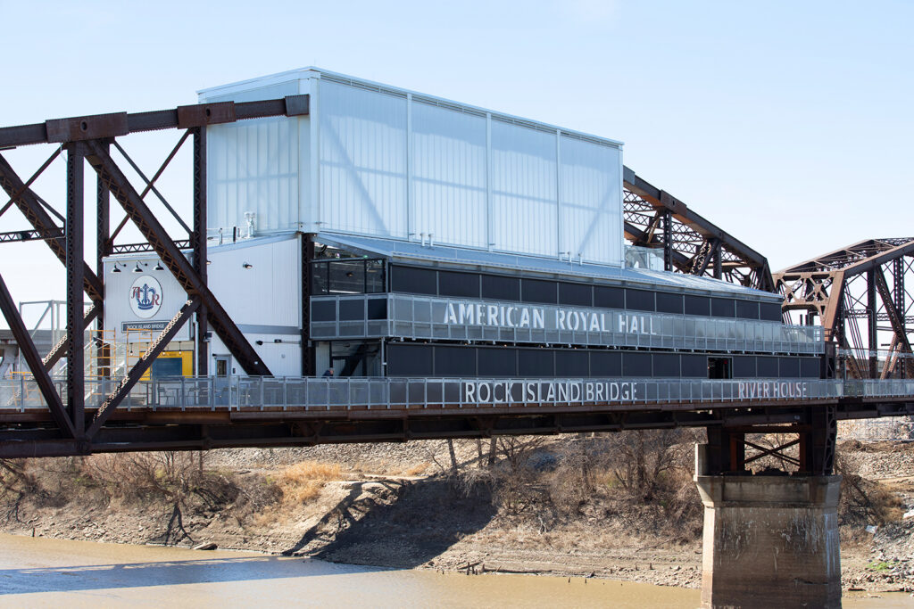 While much of the bridge is open-air, allowing unparalleled river views, enclosed amenities include the River House Restaurant and bar (a table-service concept from Una Familia Restaurant Group) and the American Royal Hall (a 350-person event space on the top deck, featuring the Royal Bar, a green room, and restrooms).