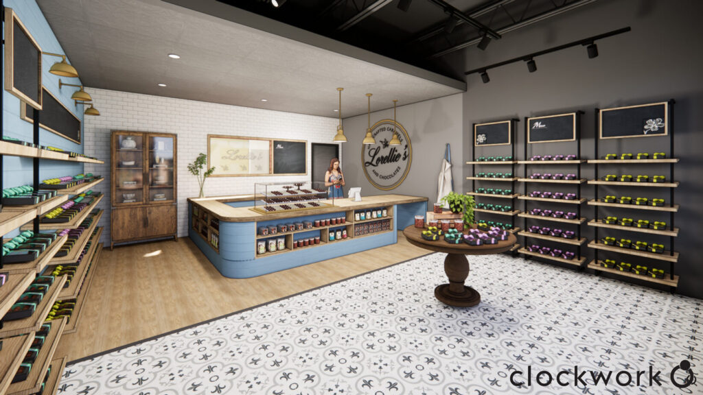 A rendering of the new Lorellie’s Handcrafted Caramels and Chocolates candy shop at at 8932 W. 95th St. in Overland Park; rendering by Clockwork Architecture + Design