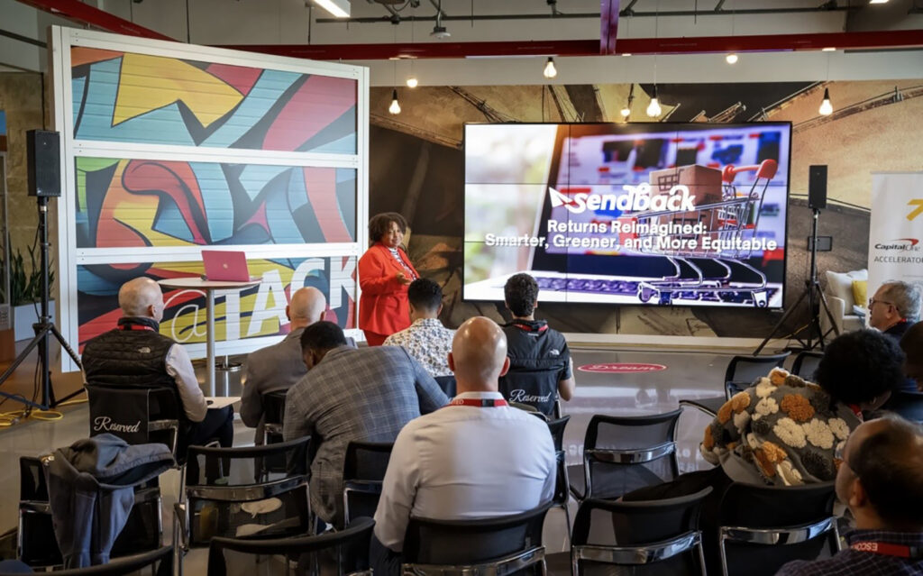 Shaniqua Jones-Williams, founder of SendBack, pitches during a Capital One accelerator demo day; courtesy photo
