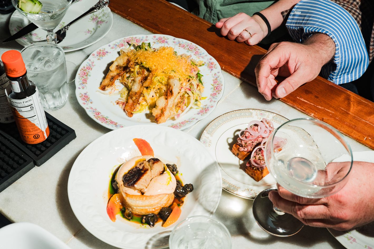 Back at Butterworth’s, the restaurant’s chef-partner, Bart Hutchins, said he’s serving plenty of crab, too, mingled in the Scottish breakfast specialty kedgeree; or in soft-shell form, dressed with fresh peas as a dinner entrée, or as an excellent lunchtime sandwich squeezed with a homemade roulade inside a soft sesame-seed bun. Hutchins grew up in Jacksonville, Florida — his father was a priest and his mother was a cop — and told me he had dreams of becoming a writer before settling on the chef’s life. He described the simple, boxlike room as a “clubhouse kind of restaurant” and said the eclectic, slightly homey décor (a portrait of Queen Elizabeth on the wall, an antique coat rack purchased by Alex Butterworth at a rummage sale) was inspired by the kind of quirky, personalized brasseries he enjoys visiting when he’s in France.